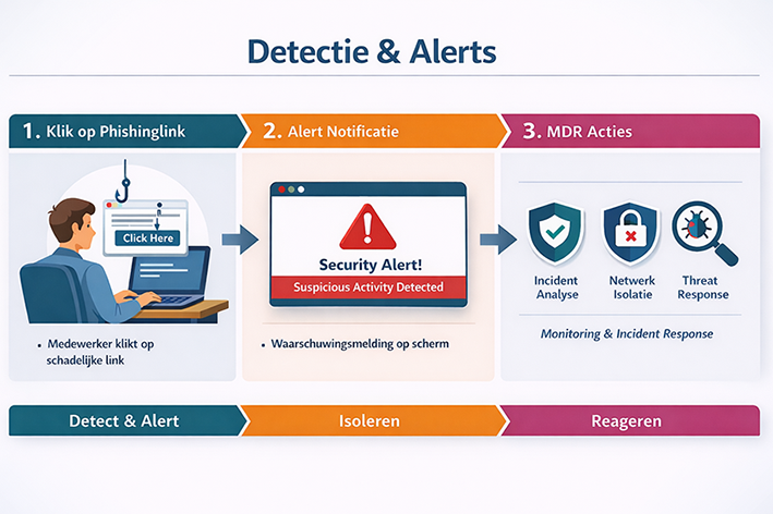 MDR (Managed Detection and Response) is de overkoepelende dienst waarbij een gespecialiseerd team uw omgeving 24/7 monitort, dreigingen analyseert en direct reageert.